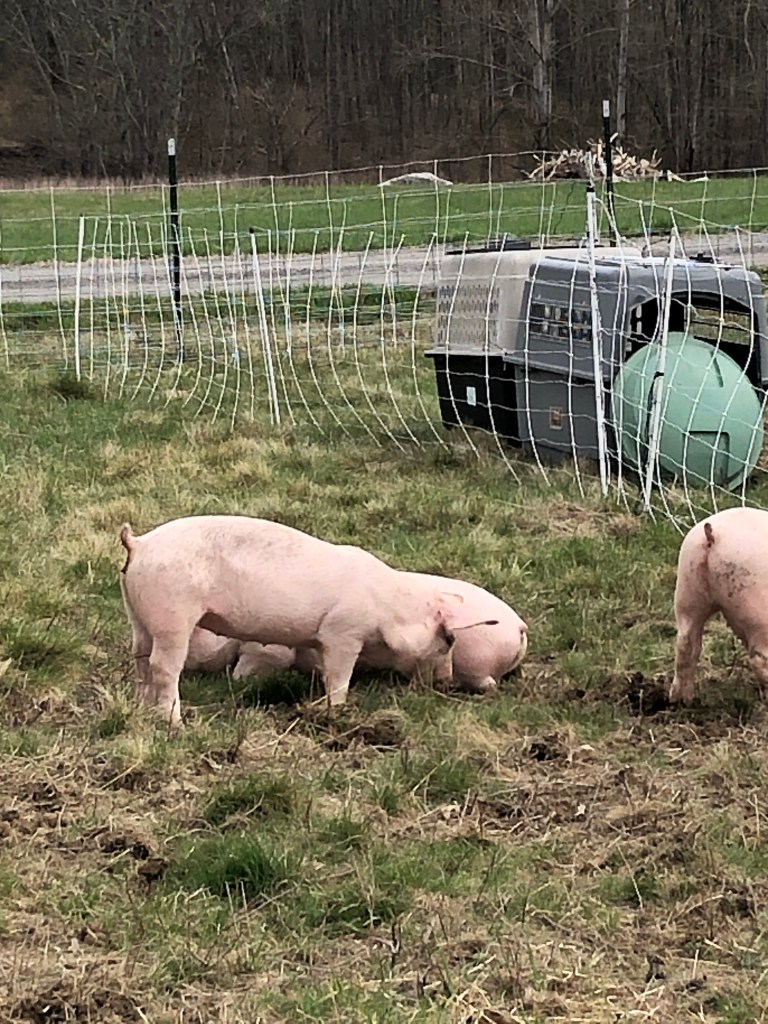 The pigs arrived in two dog crates.  They were about the size of a medium dog, pinkish, with some black smudges.  Two boys, one girl.  They won’t have names because they are going to be meat.