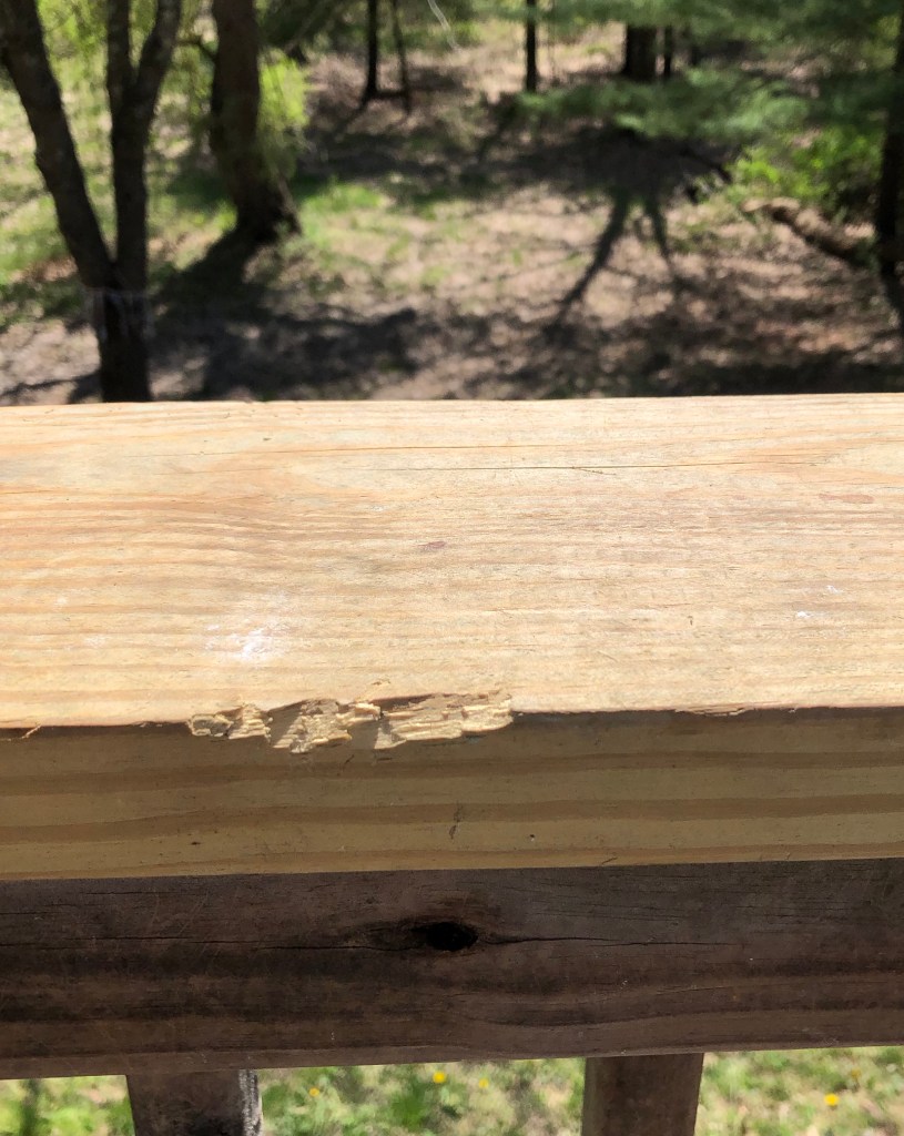 I ran inside and called my husband to see the damage. It was then we noticed the claw? tooth? gashes in the wooden rail.