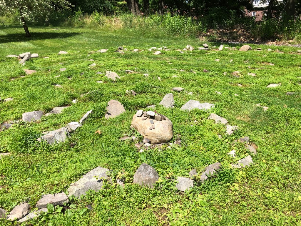 My GPS sent us on a picturesque but indirect route to the wrong part of Route 9W. We backtracked a little on 9W and eventually found Holy Cross’s curving drive that led to a large parking lot. When I slowed down to reconnoiter, I recognized the familiar pattern of stones set in the lawn on the far side of the parking lot.