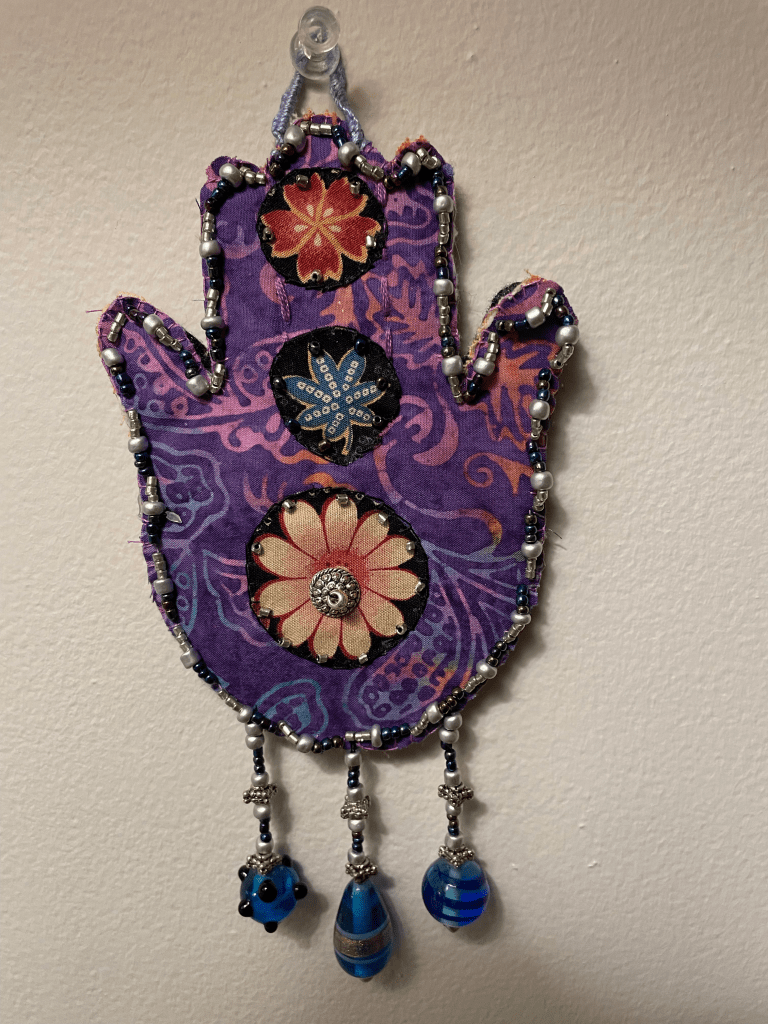 My daughter suggested including a prayer of protection, so I put one inside the layers of fabric of each hamsa: